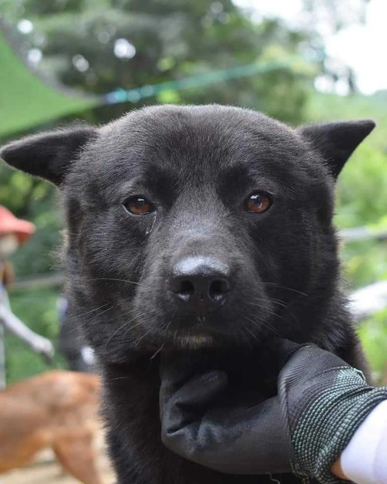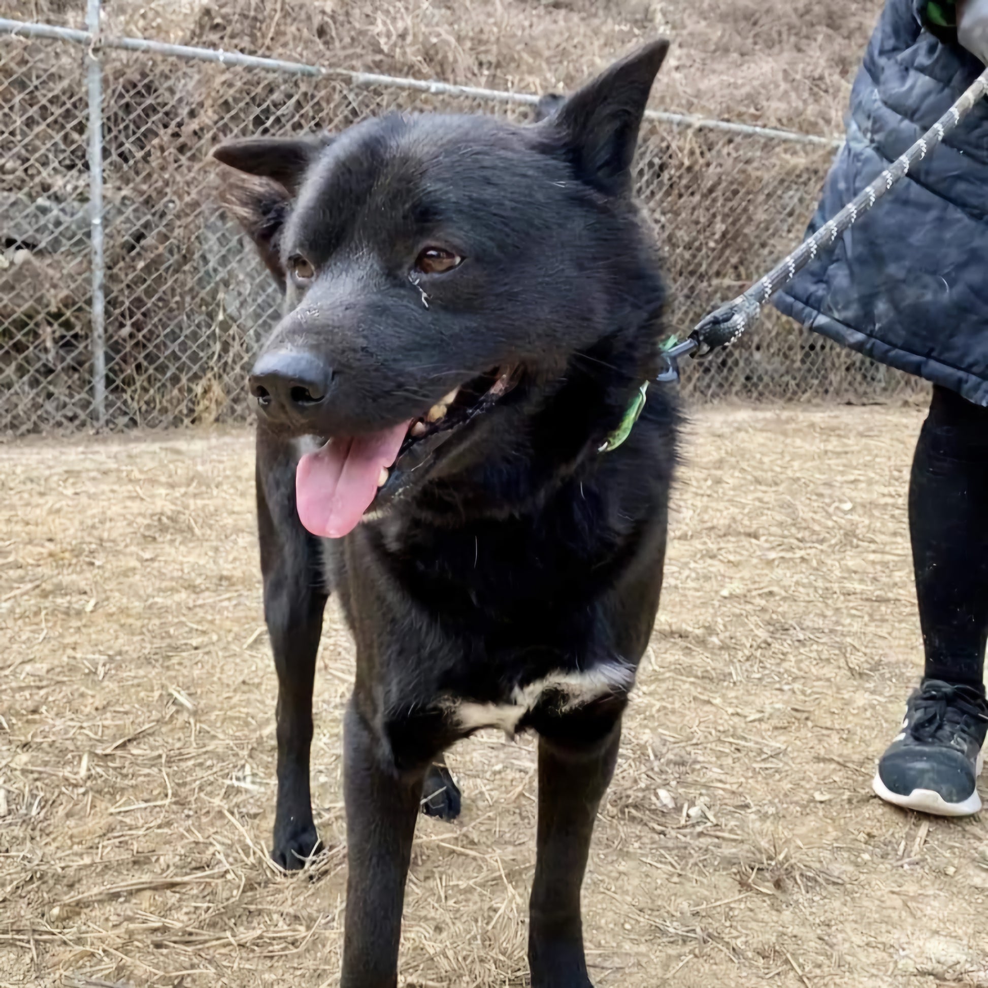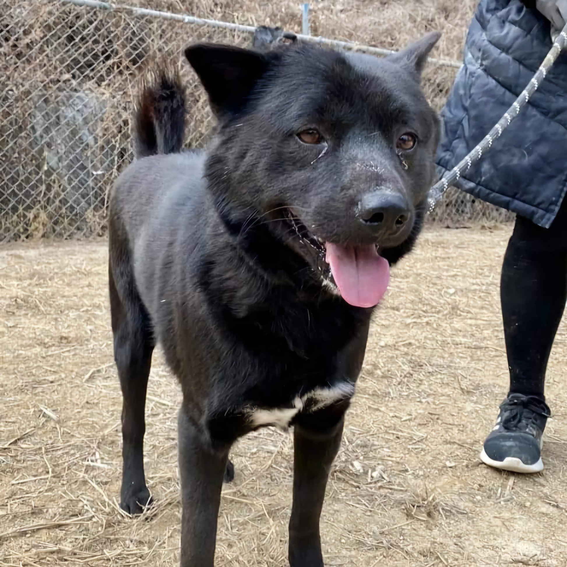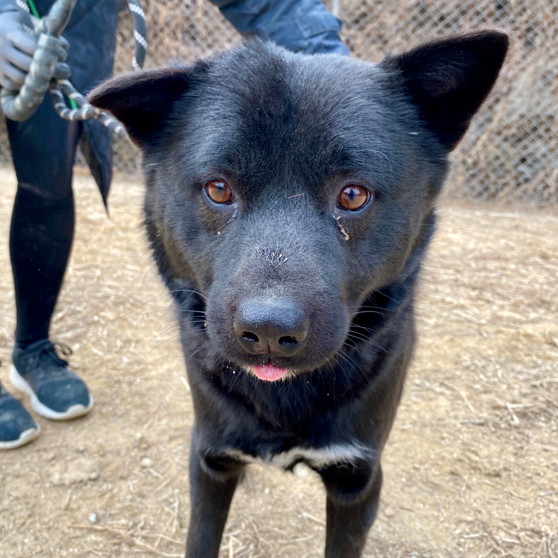 Er ist auch ein sehr hübscher Hund mit großen, runden Rehaugen, die hell und haselnussbraun sind. Er ist ein schwarzer Hund, was es hier in Korea schwierig machen wird, einen Adoptierenden zu finden, da schwarze Hunde hier nicht häufig als Haustiere gewählt werden. Aber Bambi ist auf seine Art niedlich, er hat sogar eine weiße Brust und eine gefrostete Pfote.