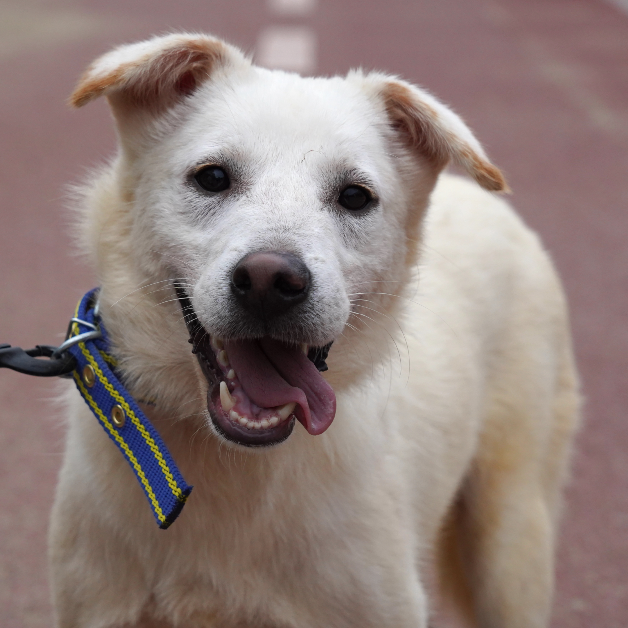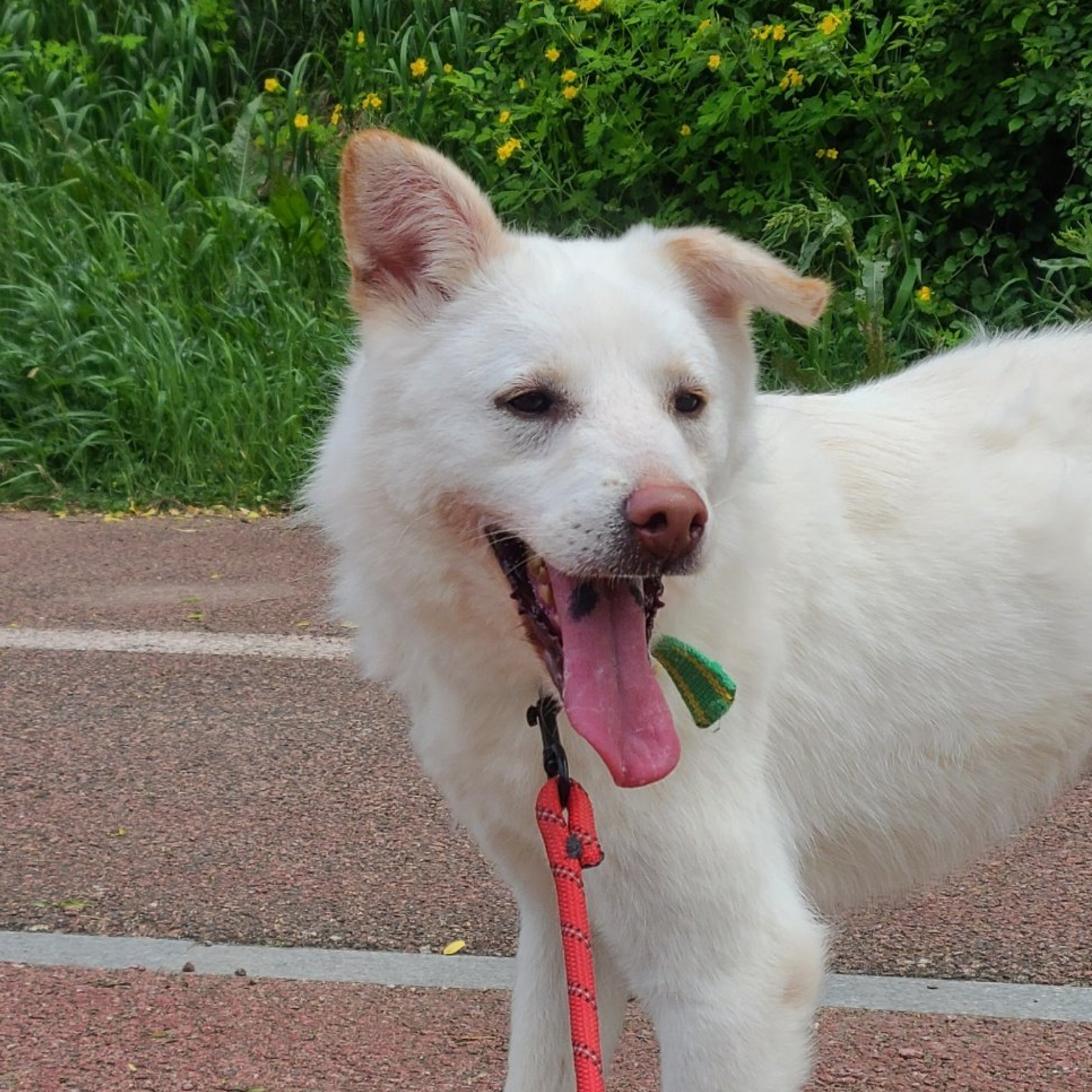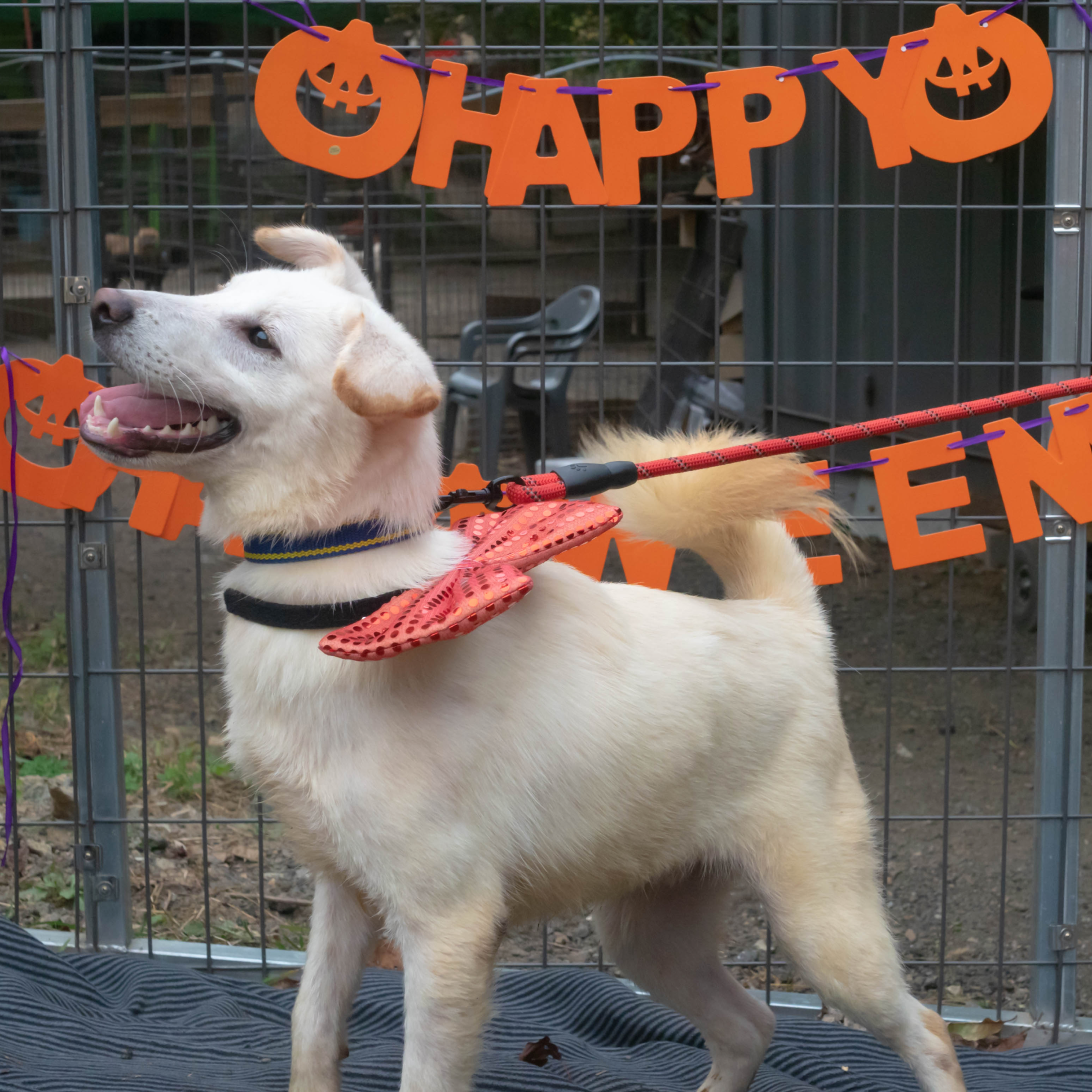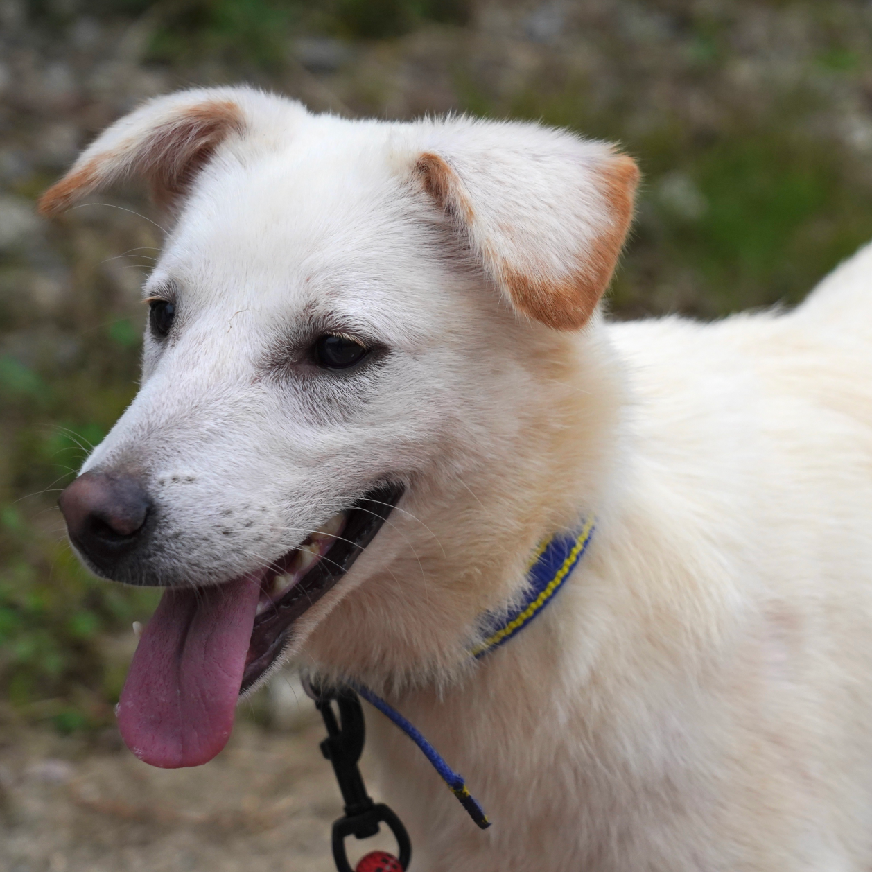 "Schaut euch nur seine niedlichen Ohren an!! Er hat das größte und strahlendste Lächeln. Das ist Fizz aus Zwinger D2. Fizz war ziemlich schüchtern. Er zuckte bei lauten Geräuschen von Autos zusammen und wich zurück, wenn andere Hunde oder Menschen sich näherten. Er ist ein wunderschöner Junge, der sanfte Streicheleinheiten genießt, wenn ich mich langsam annähere. Er läuft gut und zieht nicht zu stark an der Leine. Fizz sucht nach einem geduldigen Menschen, der ihm viel Liebe schenken kann."