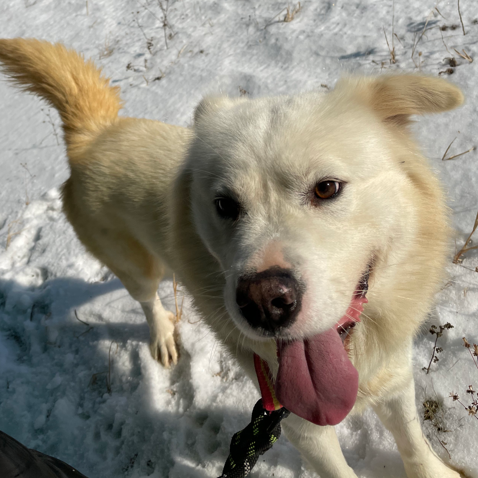 "Jurie hat den schönsten Schwanz und ist so ein glücklicher, lächelnder Hund. Er ist lebhaft und fröhlich beim Spazierengehen! Er mag Spaziergänge lieber als Snacks. Er mag Menschen und er hat die niedlichsten Augen und eine gefleckte Nase. Es ist wirklich traurig, dass dieser wunderbare Hund meistens im Tierheim angebunden ist."