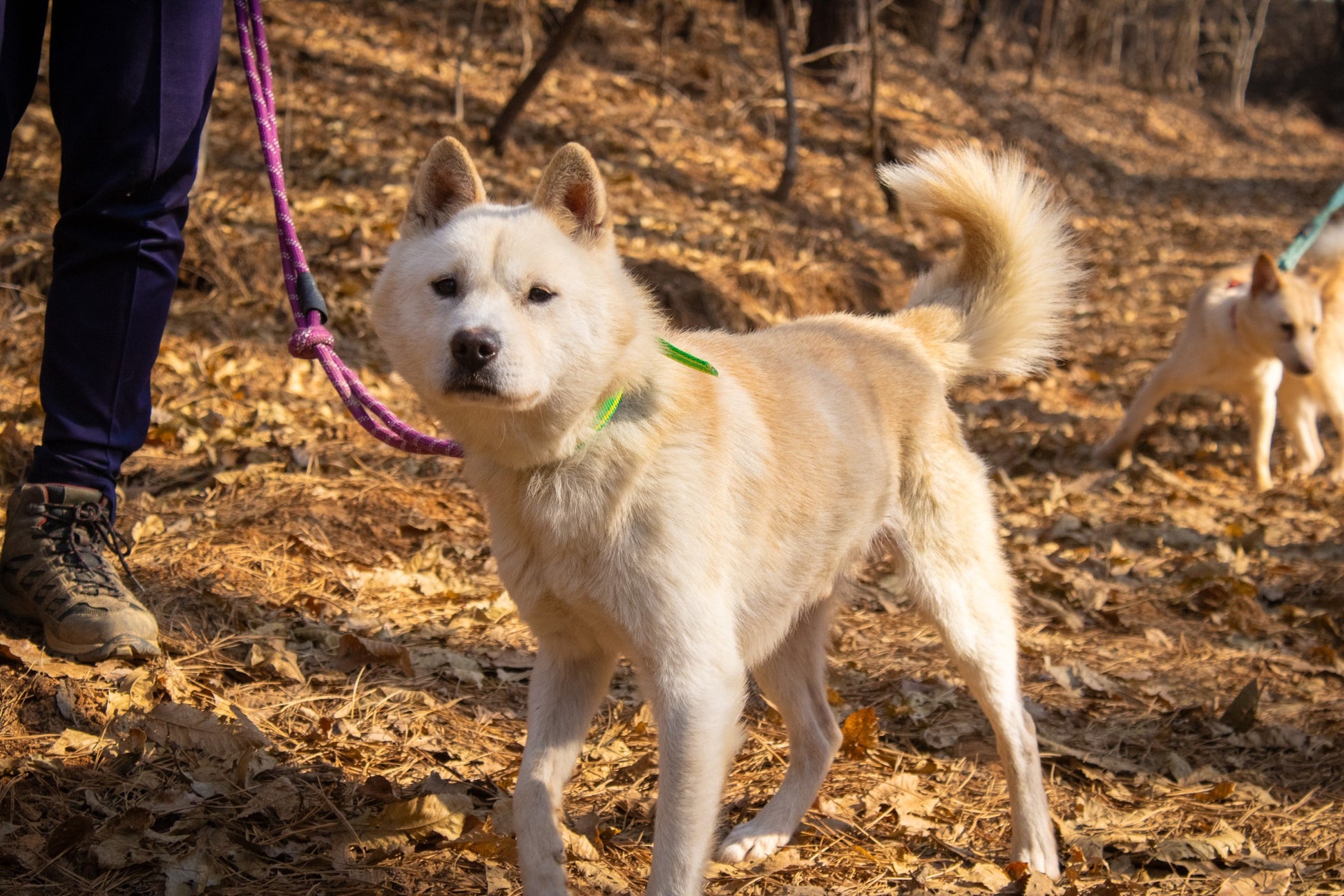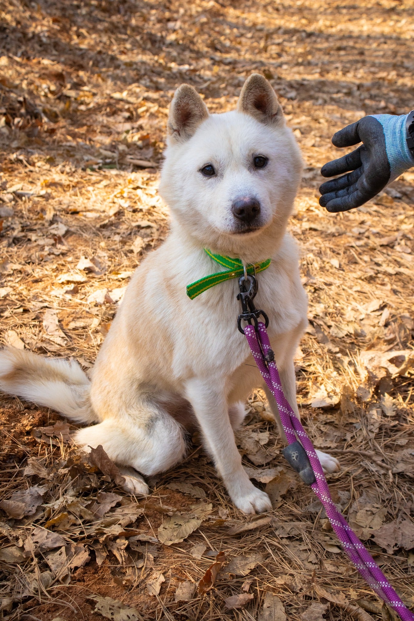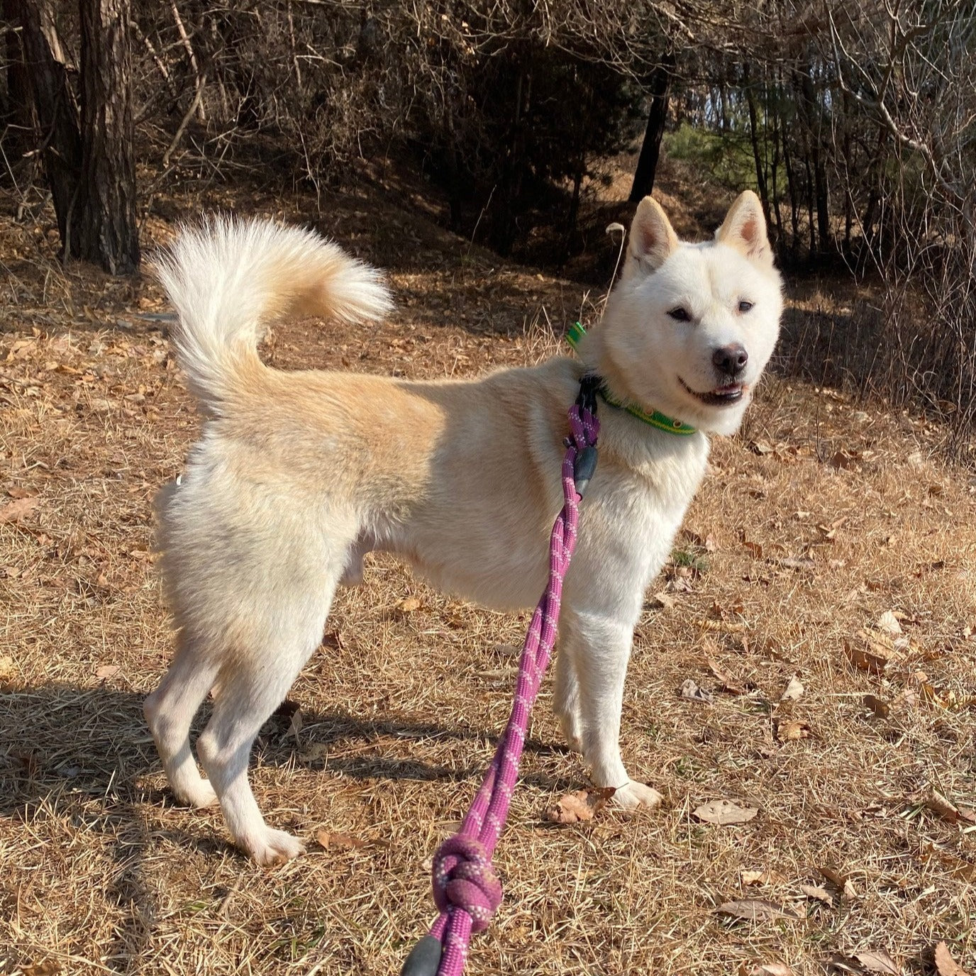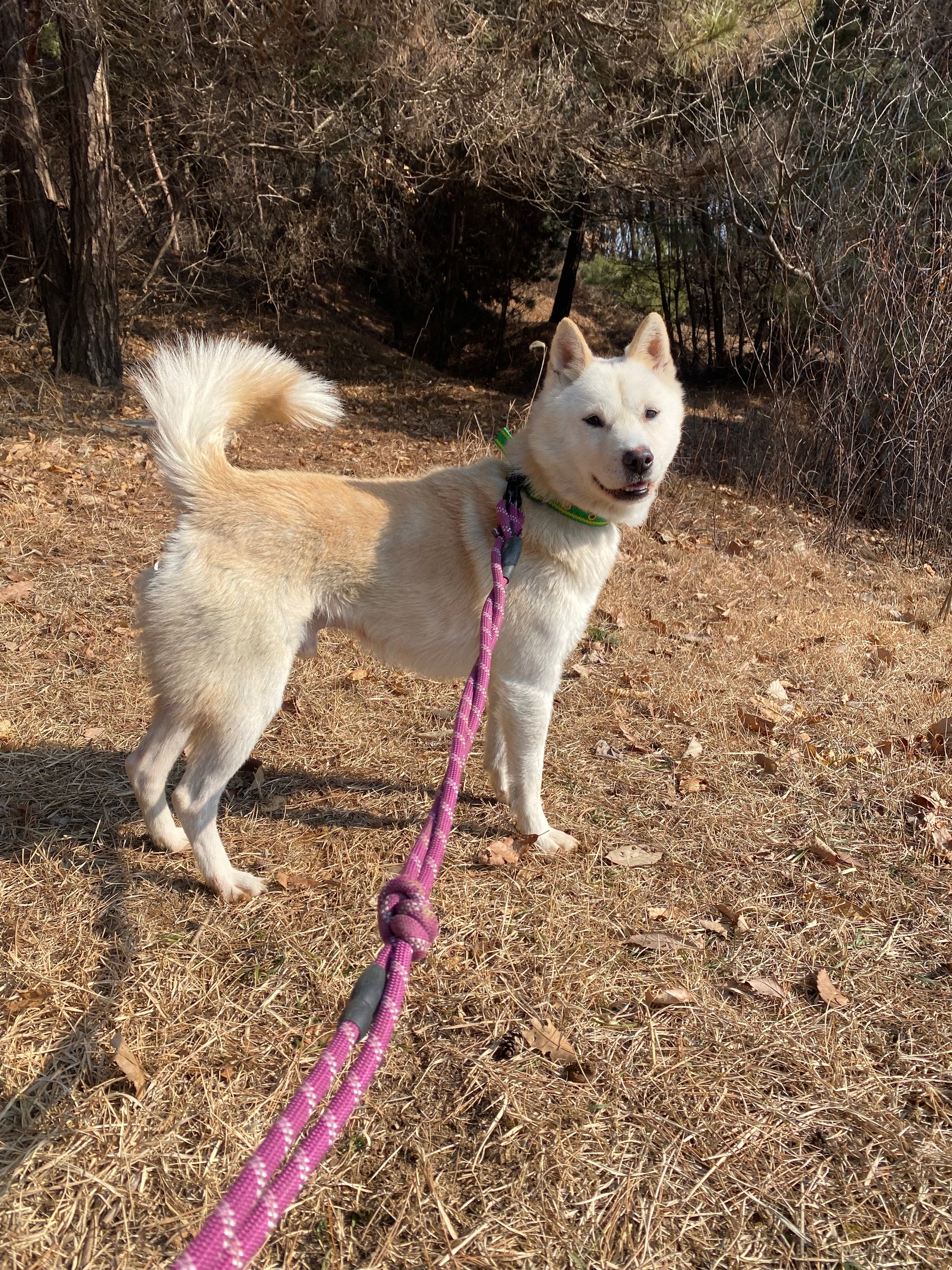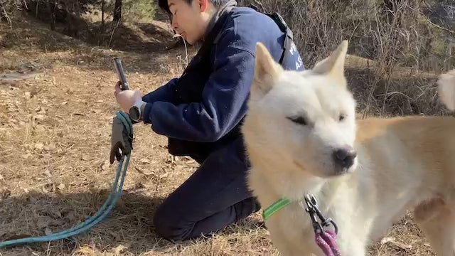 Er versteht sich auch sehr gut mit seinem Zimmergenossen, der ebenfalls ein Jindo-Mix ist. Matteo hat definitiv diesen klassischen Jagdinstinkt und ein scharfes Sehvermögen, was bedeutet, dass er ziemlich aufgeregt wird, wenn er andere Tiere wie Rehe oder andere Hunde in der Ferne sieht. Sobald er jedoch seinem Ziel nahekommt und realisiert, dass es nur ein anderer Hund wie er ist, reagiert er nicht aggressiv und verliert größtenteils das Interesse. Außerdem könnte mit seiner guten Konzentration und seiner Futtermotivation ein wenig konsequentes Training so viel bewirken!