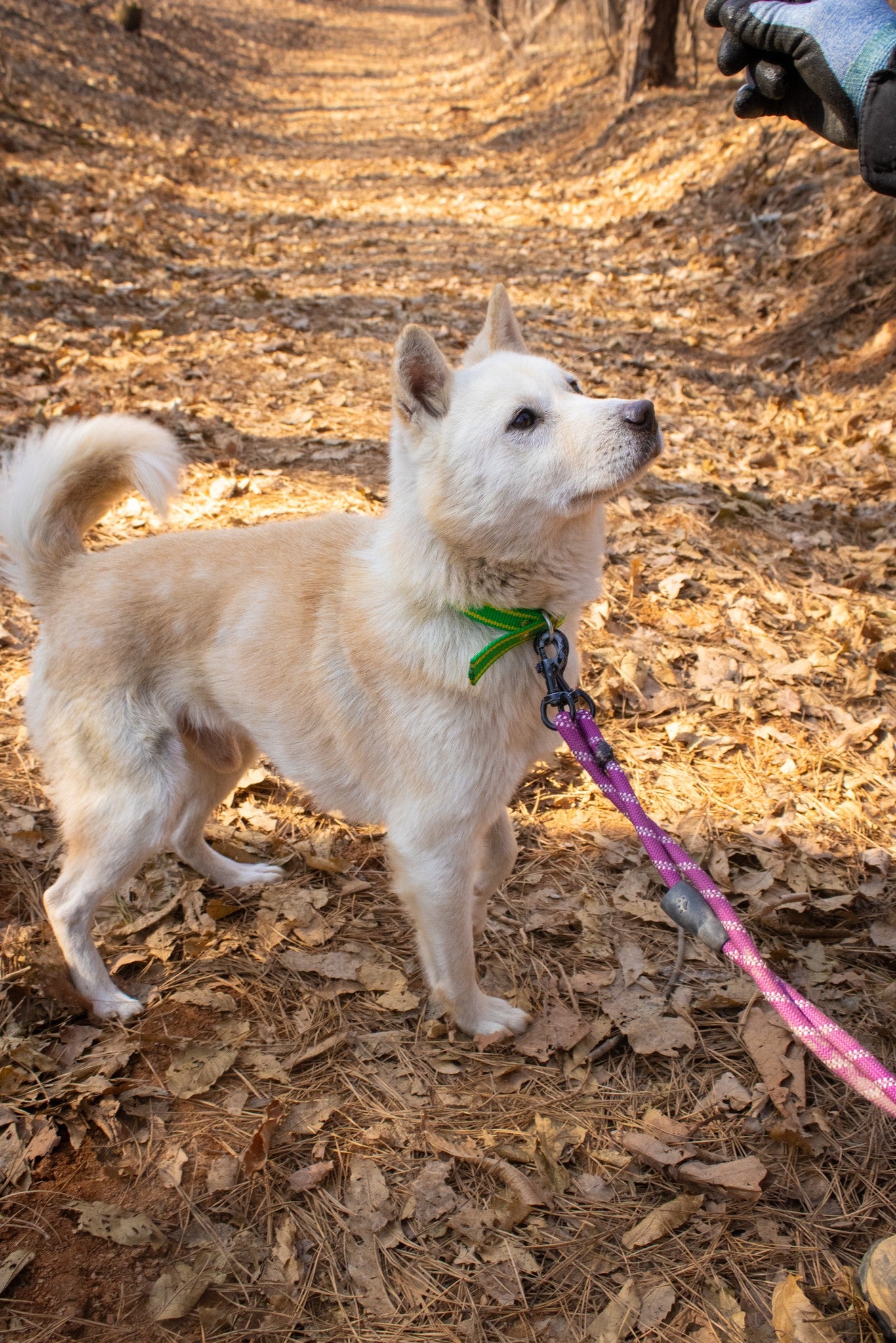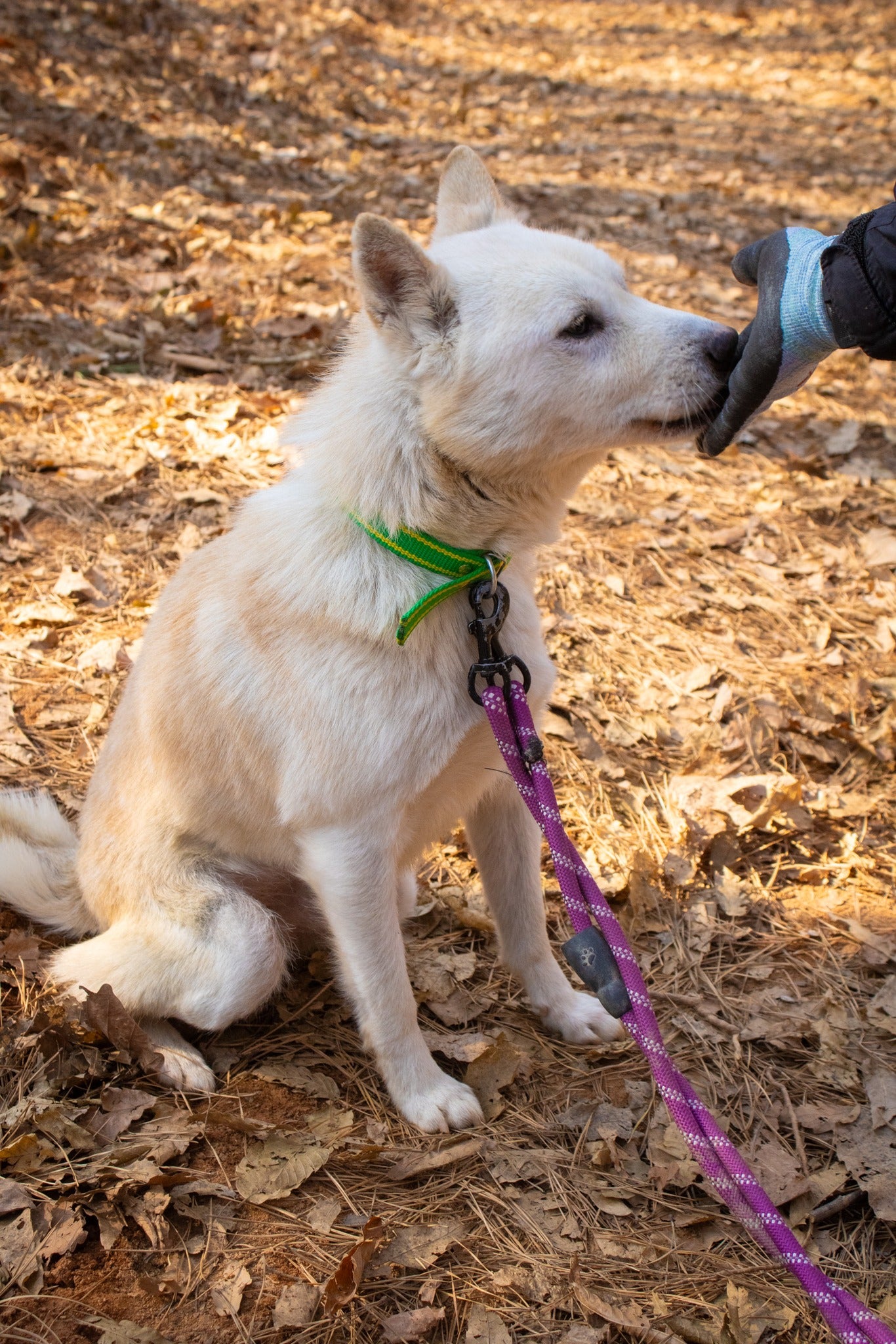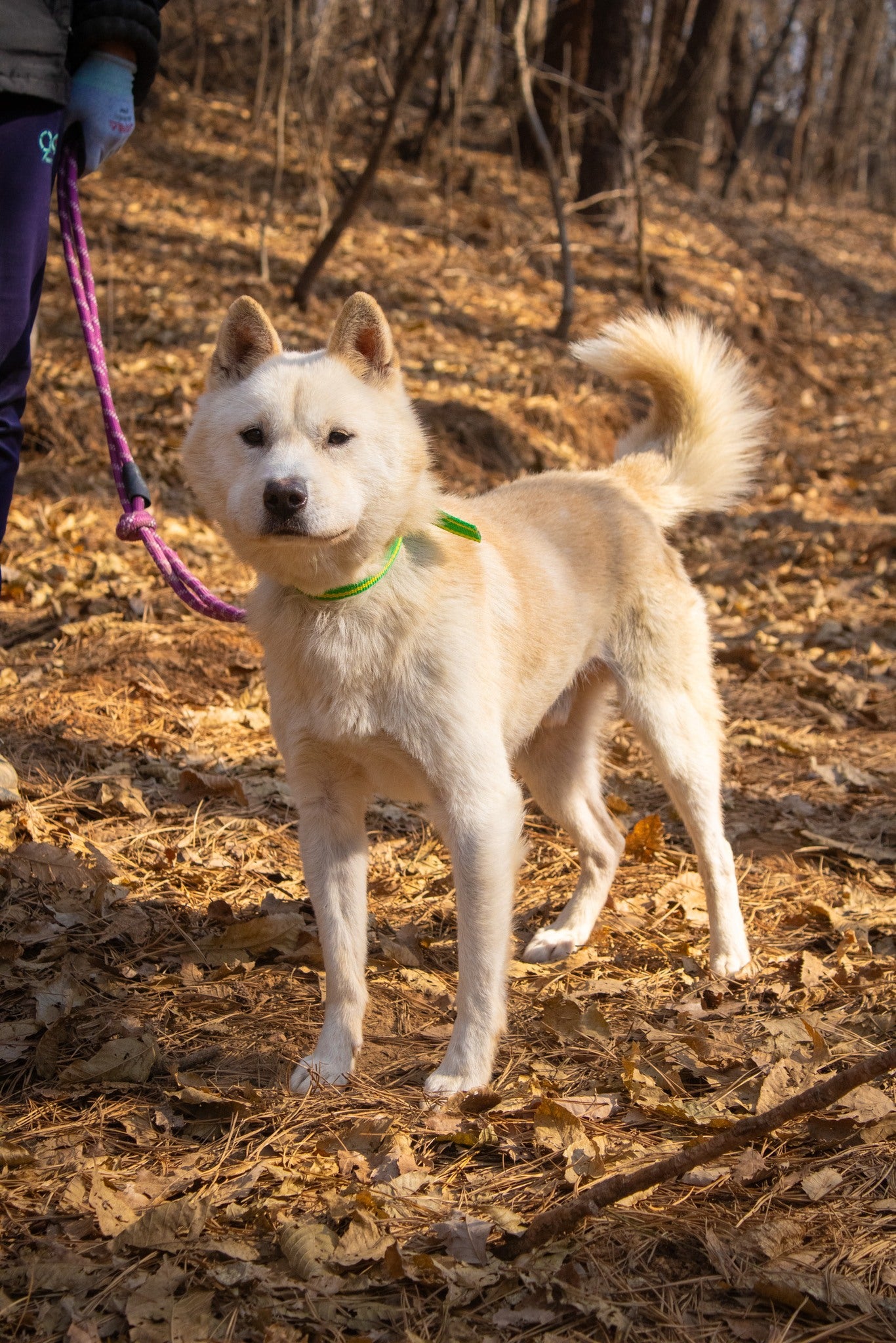 Er versteht sich auch sehr gut mit seinem Zimmergenossen, der ebenfalls ein Jindo-Mix ist. Matteo hat definitiv diesen klassischen Jagdinstinkt und ein scharfes Sehvermögen, was bedeutet, dass er ziemlich aufgeregt wird, wenn er andere Tiere wie Rehe oder andere Hunde in der Ferne sieht. Sobald er jedoch seinem Ziel nahekommt und realisiert, dass es nur ein anderer Hund wie er ist, reagiert er nicht aggressiv und verliert größtenteils das Interesse. Außerdem könnte mit seiner guten Konzentration und seiner Futtermotivation ein wenig konsequentes Training so viel bewirken!