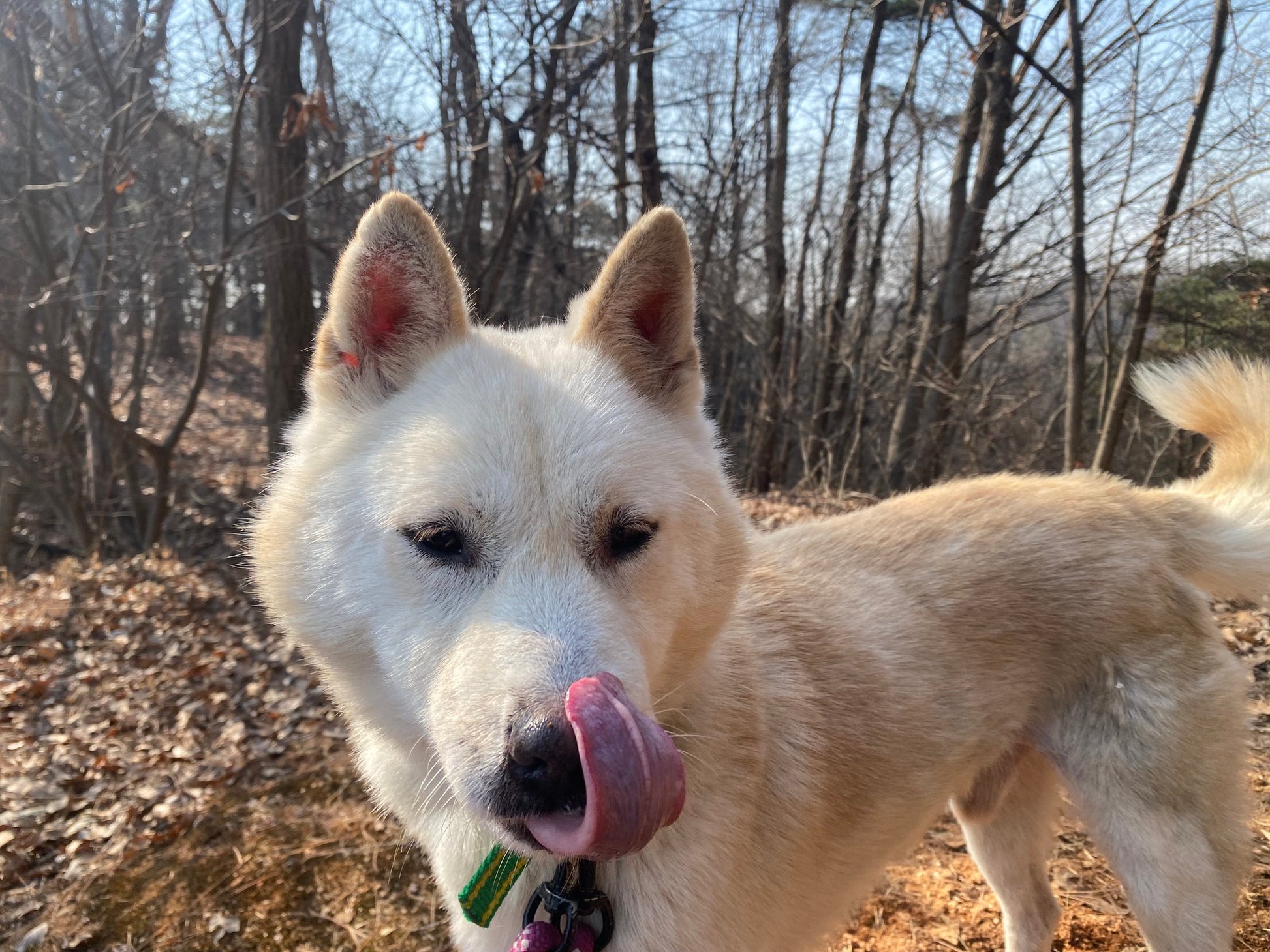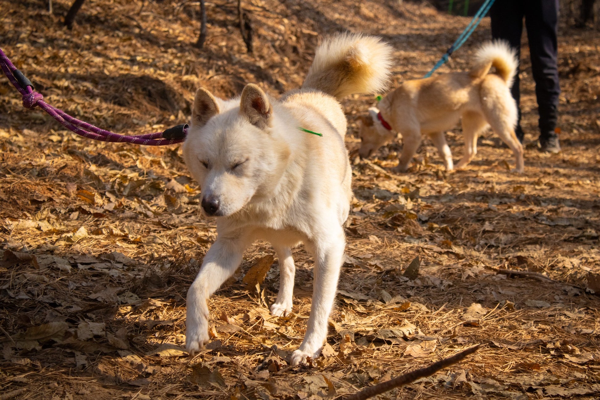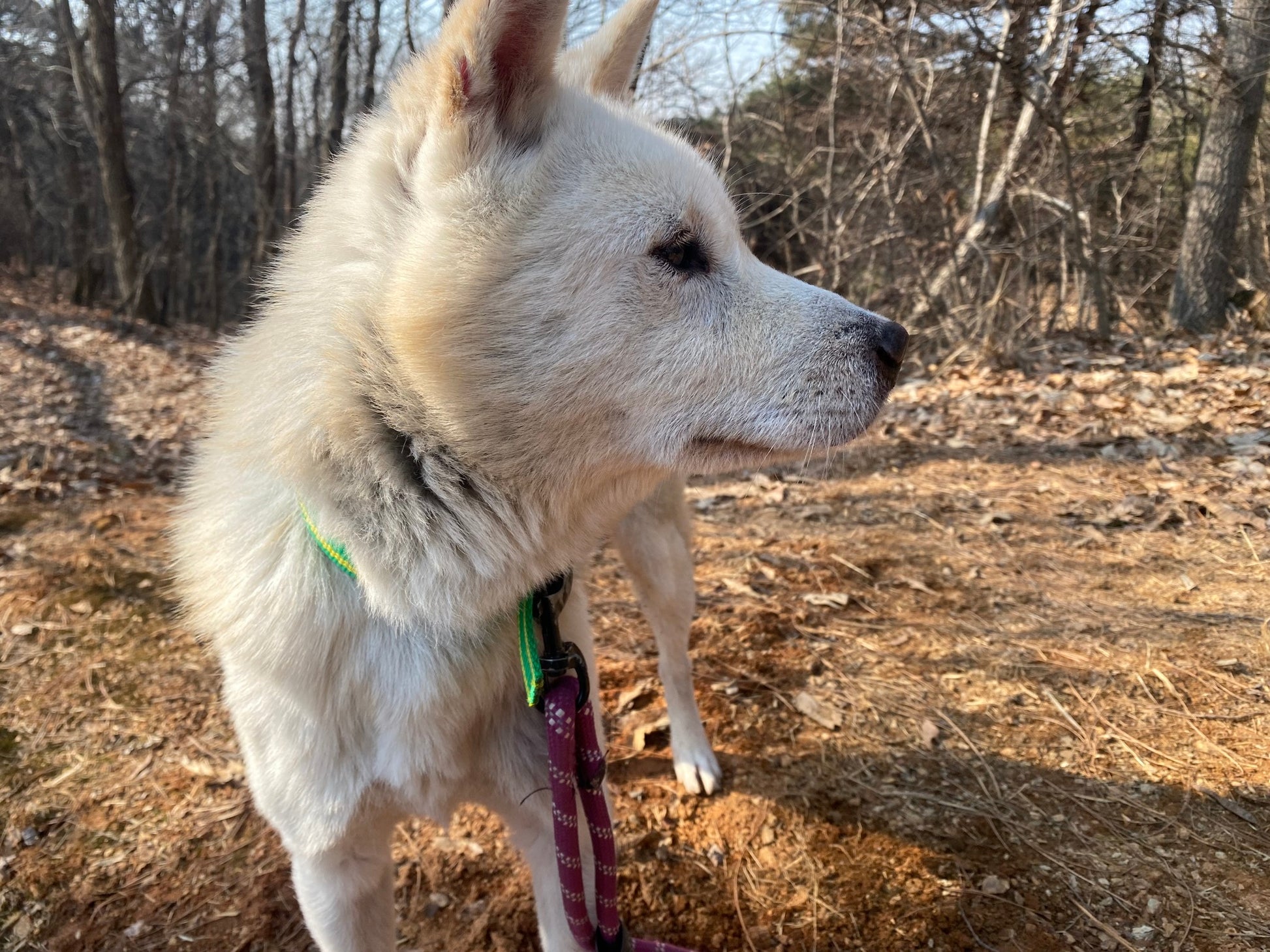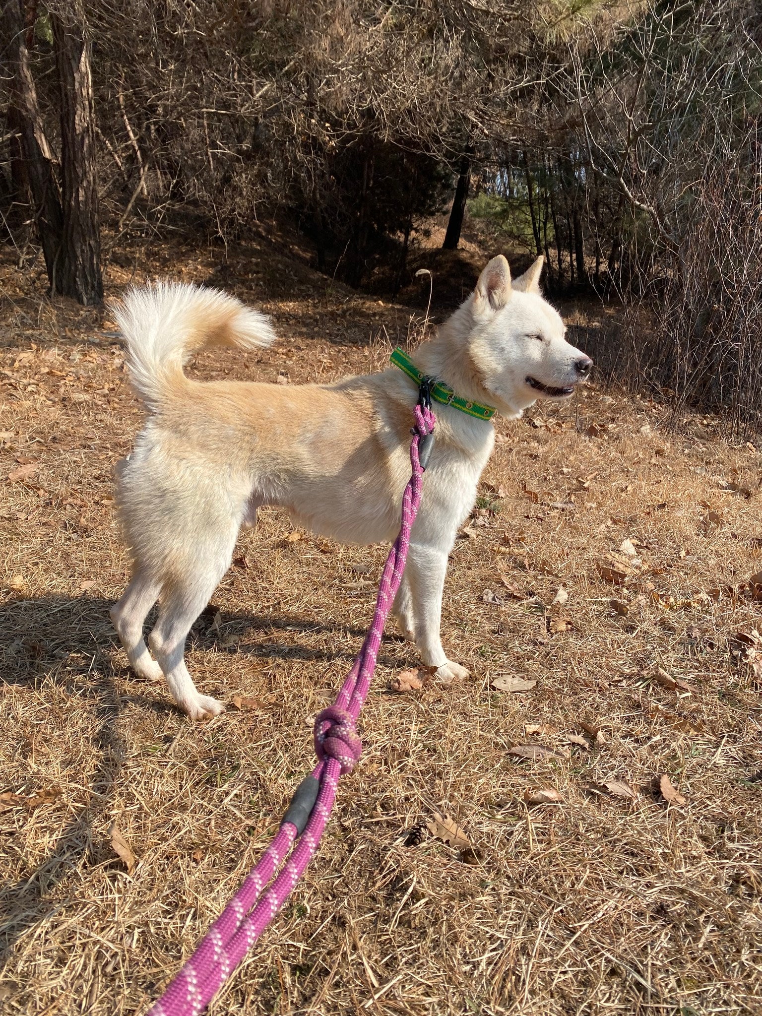 Er versteht sich auch sehr gut mit seinem Zimmergenossen, der ebenfalls ein Jindo-Mix ist. Matteo hat definitiv diesen klassischen Jagdinstinkt und ein scharfes Sehvermögen, was bedeutet, dass er ziemlich aufgeregt wird, wenn er andere Tiere wie Rehe oder andere Hunde in der Ferne sieht. Sobald er jedoch seinem Ziel nahekommt und realisiert, dass es nur ein anderer Hund wie er ist, reagiert er nicht aggressiv und verliert größtenteils das Interesse. Außerdem könnte mit seiner guten Konzentration und seiner Futtermotivation ein wenig konsequentes Training so viel bewirken!