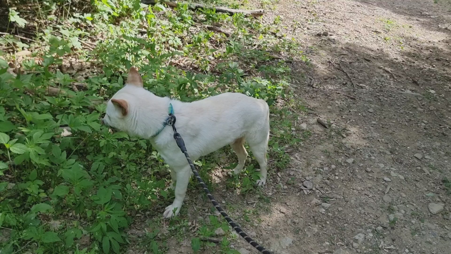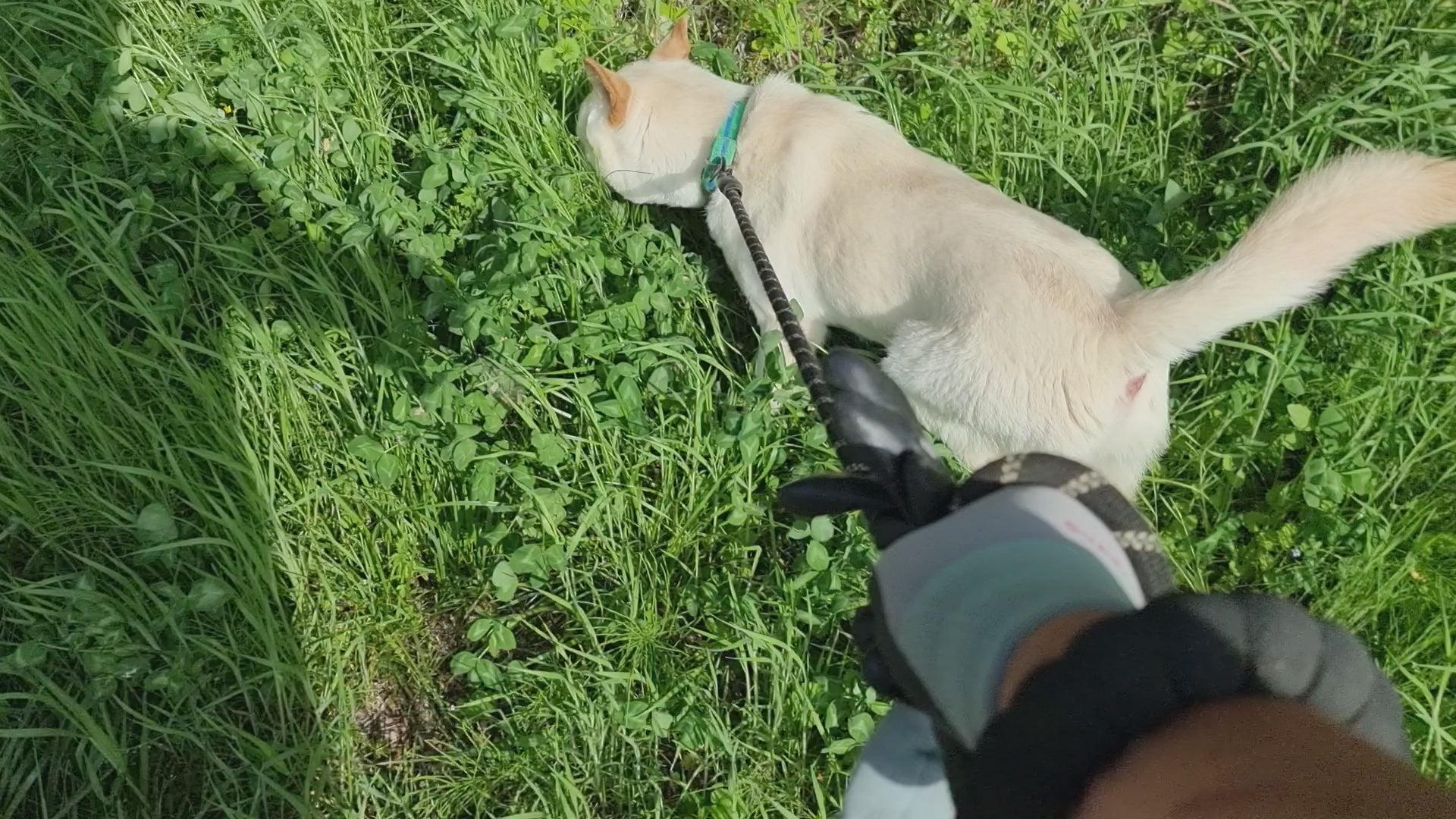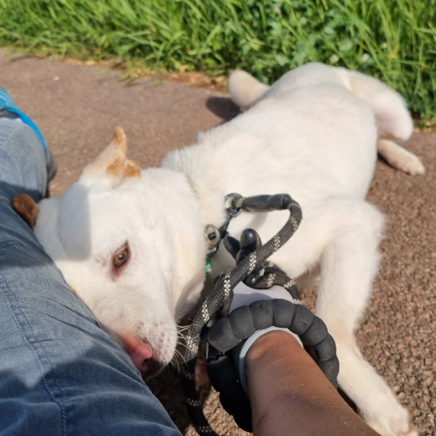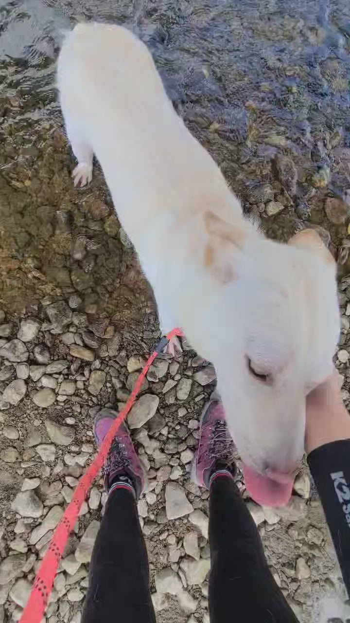 "Das ist Sven von H34, Mitbewohner von Annie. Sie sind beide super energiegeladene Spaßvögel, aber Sven ist der alberne von beiden. Er lief herum und konnte seine Begeisterung nicht zurückhalten. Er mochte es mehr, in den Fluss zu gehen, als Leckerlis zu bekommen. Er hatte vor nichts Angst, aber er ist noch nicht ganz daran gewöhnt, von Menschen gestreichelt zu werden. Aber ich bin sicher, dass Sven mit etwas Leinenerziehung und Liebe ein großartiger Begleiter für jemanden sein wird, der einen energiegeladenen Fellkumpel möchte."
